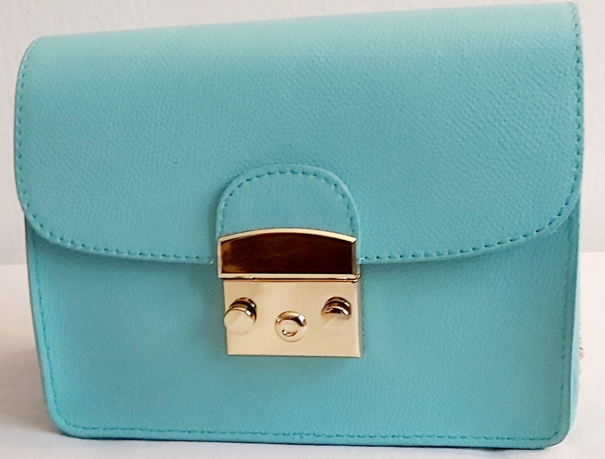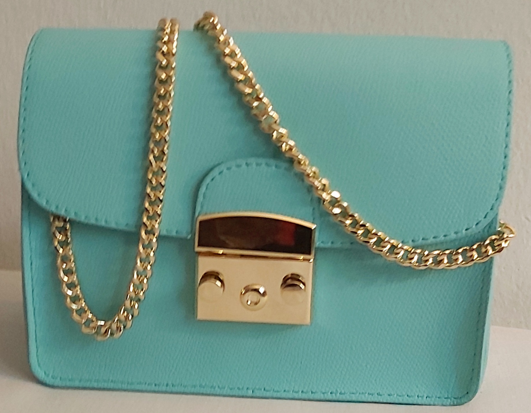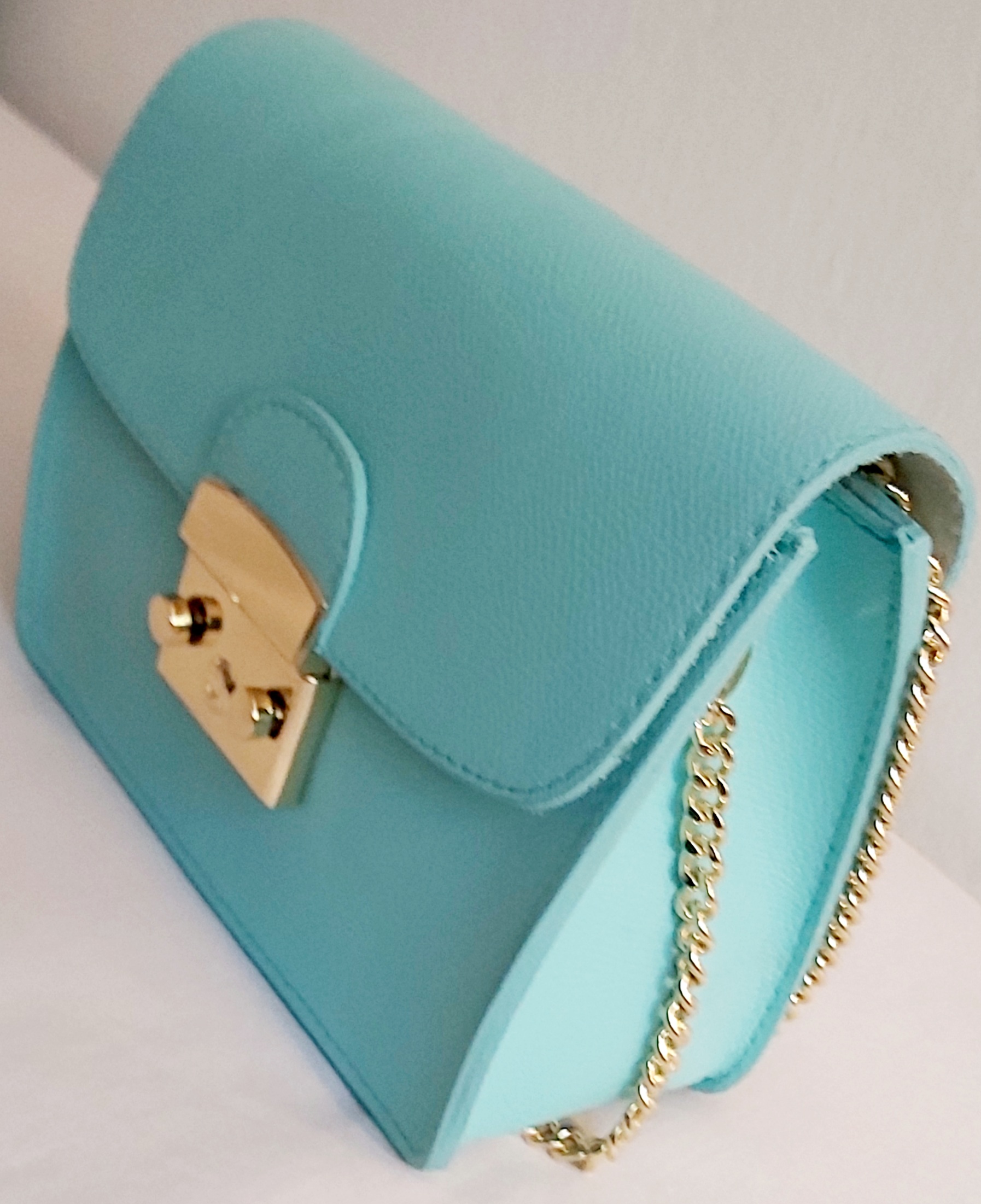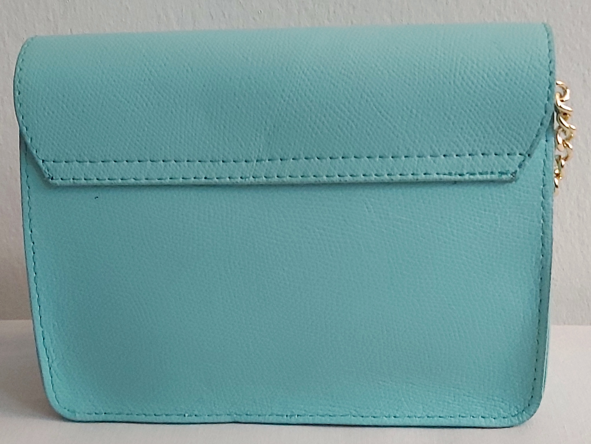 Ce sac en cuir de haute qualité est un petit bijou qui sublimera toutes vos tenues. Fermoir métallique bouton-pression articulé en métal doré sur rabat Porté épaule avec une anse chaine dorée. Finitions métalliques dorées 1 compartiment + poche intérieure ouverte Dispose d’une sangle métallique convertible en poignées Compartiment principal avec fermeture par boucle et rabat Intérieur doublé en cuir avec poche latérale ouverte Couleur : Bleu turquoise Dimensions : 17 x 13 x 8 cm Composition : 100% CUIR  de veau fabriqué en Italie. Doublure 100% cuir de veau. Finition raffinée.