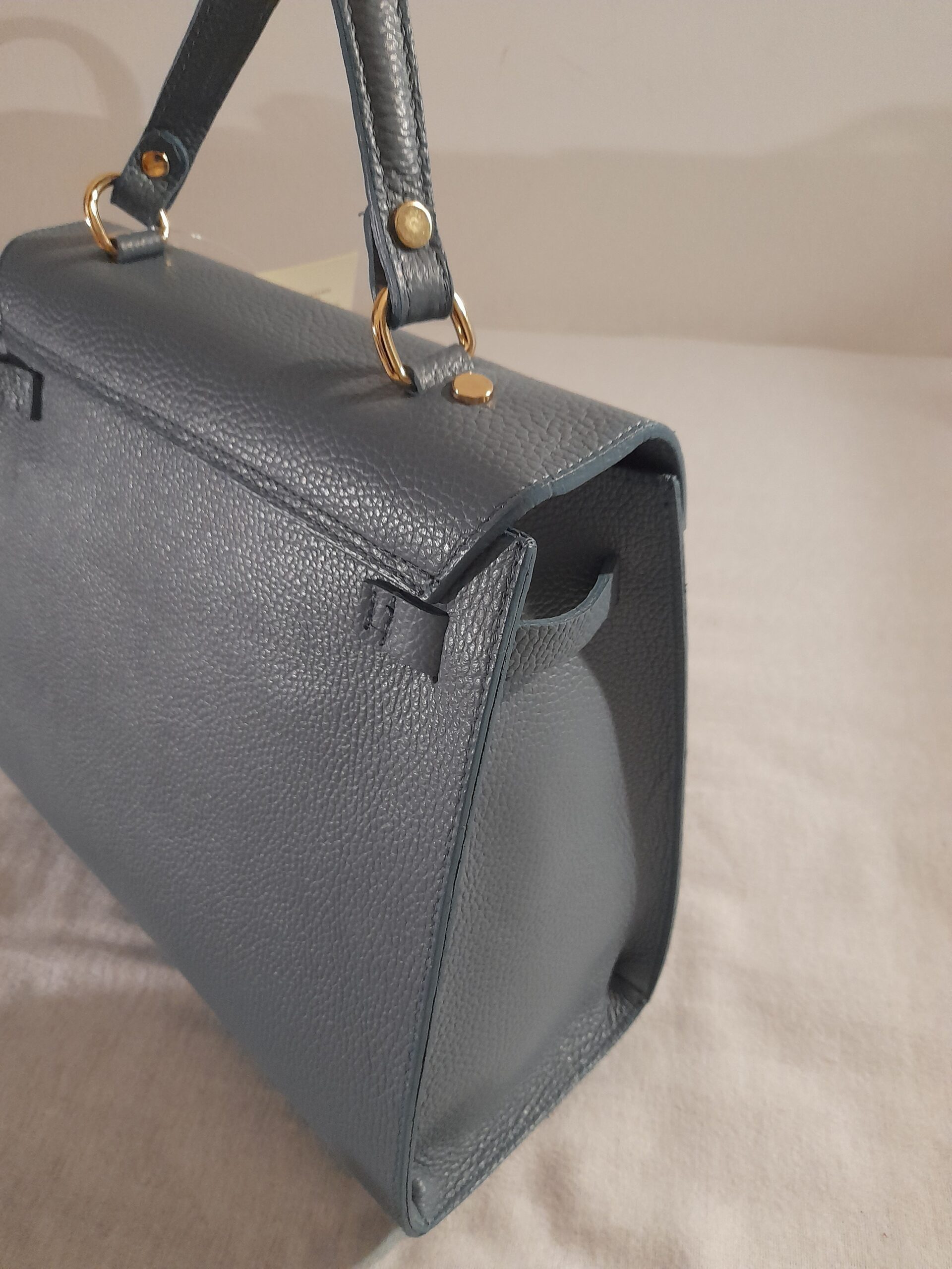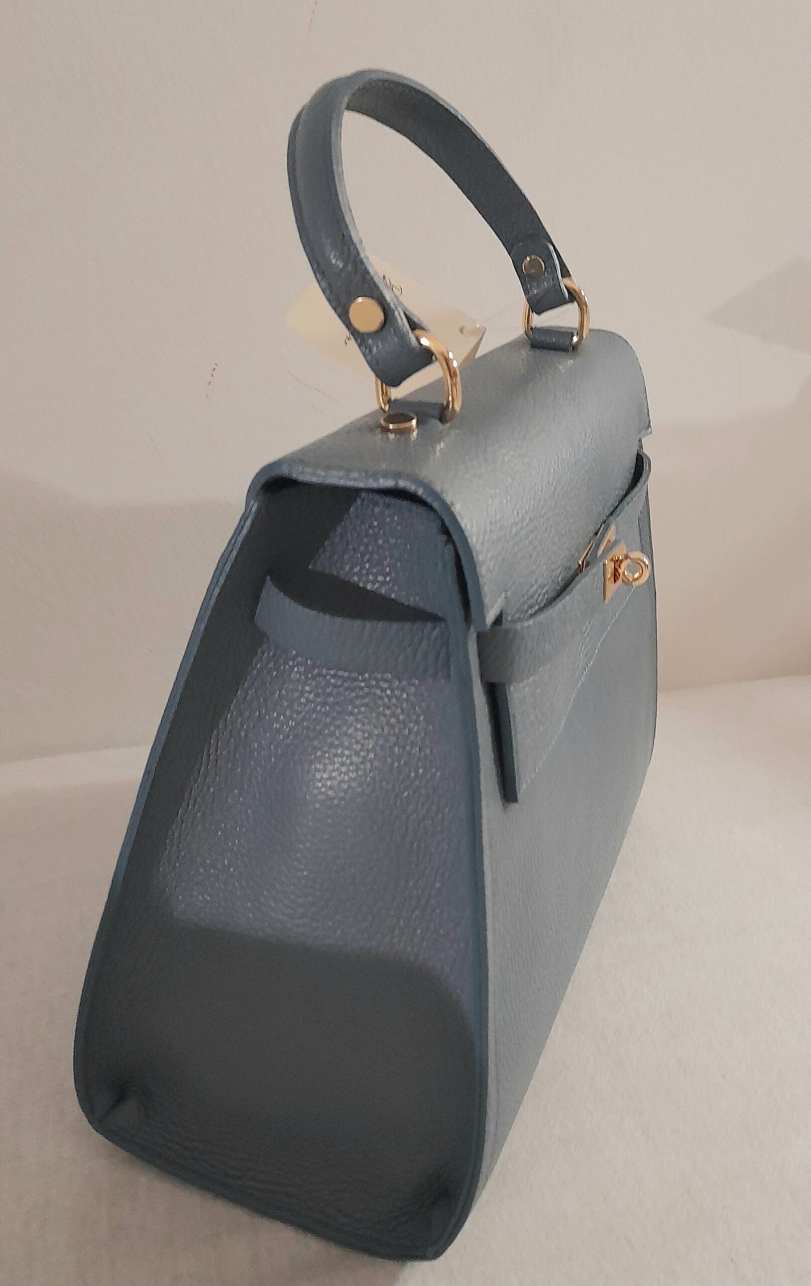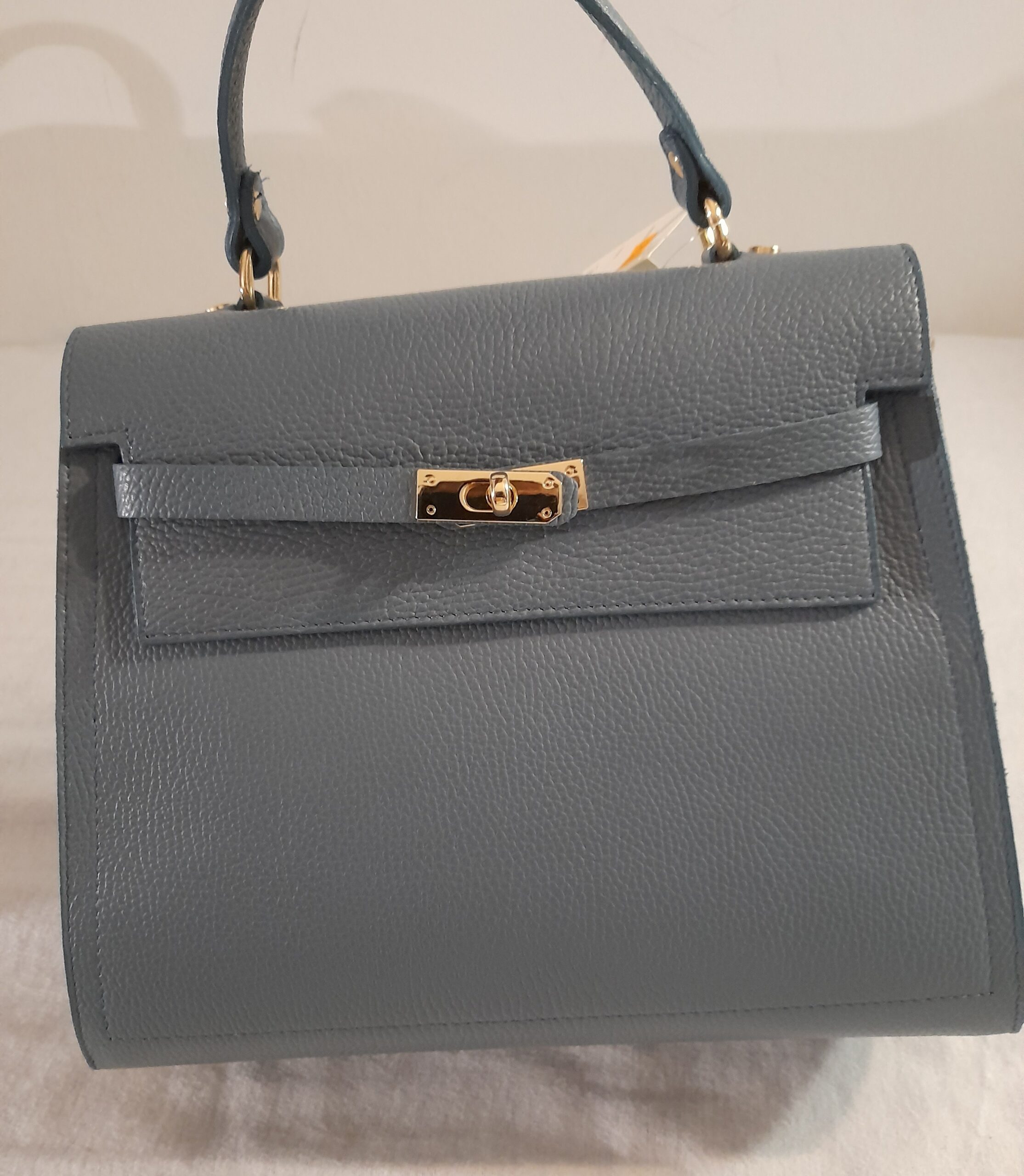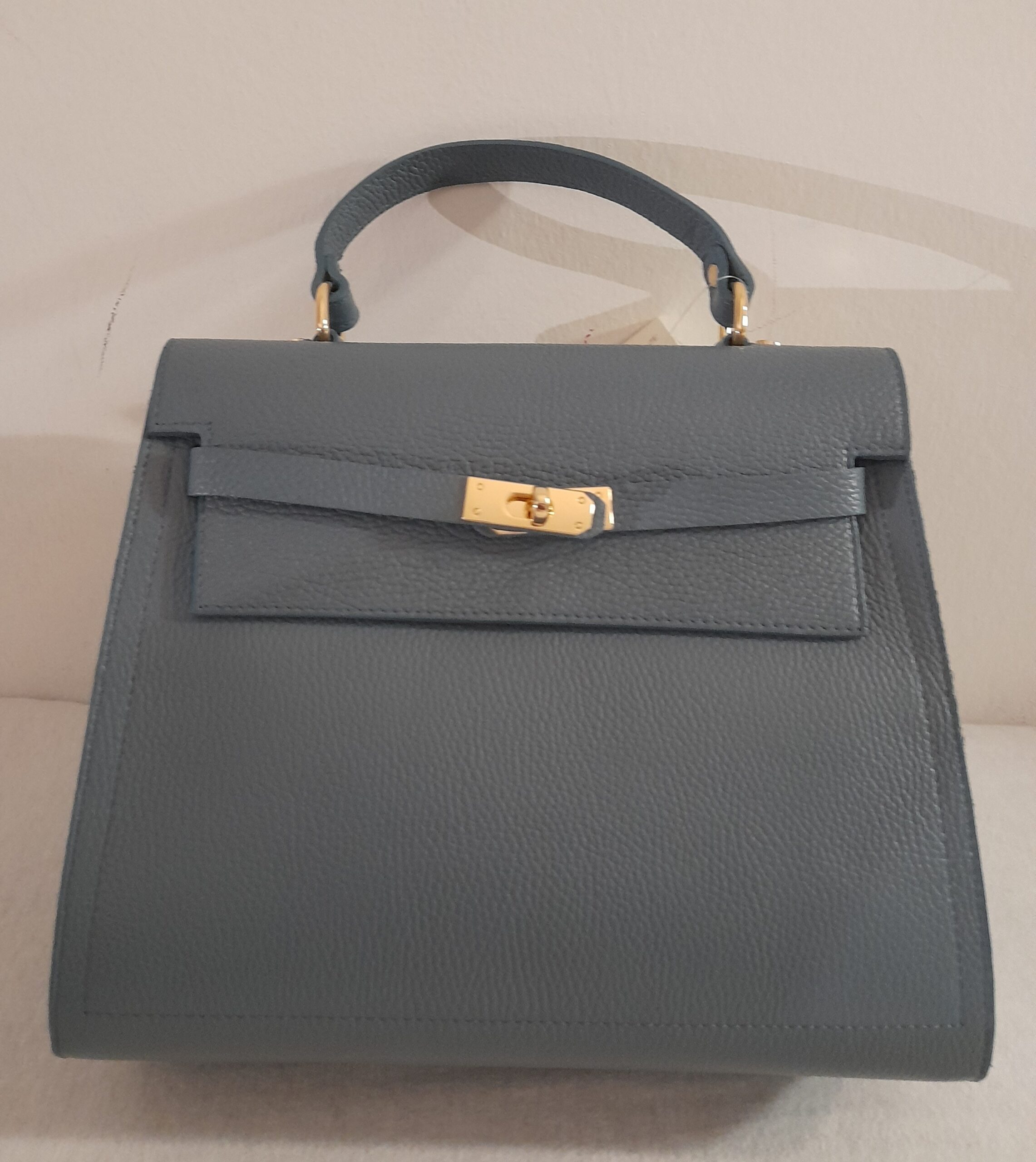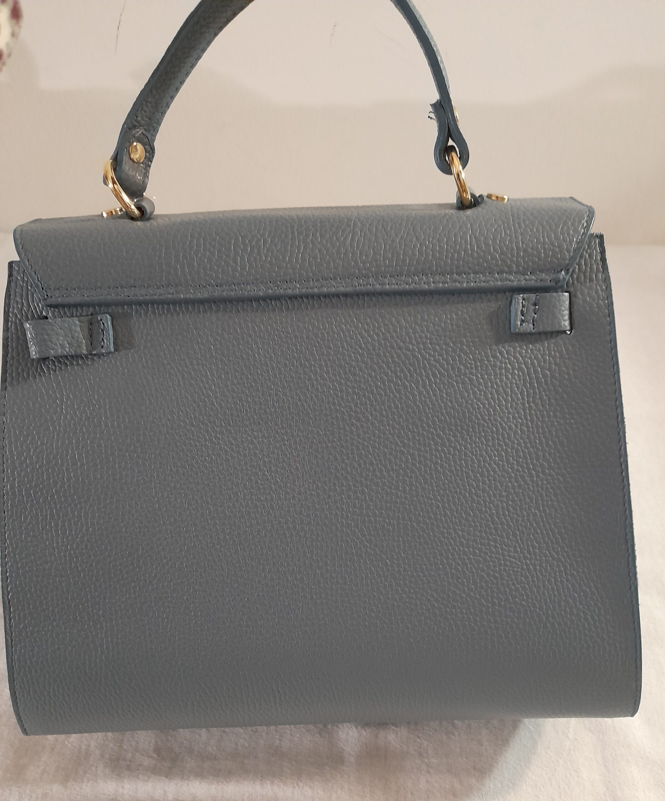 La  princesse des sacs, iconique et  élégant, fabriqué dans une matière de qualité comme le cuir de vachette. L’intérieur est doublé de cuir avec une poche latérale ouverte. Composition : 100% CUIR  de vachette fabriqué en Italie Dimensions : 28cm x 22cm x 10 cm Couleur: Bleu gris. Disponible en Rose Porté main avec poignée rigide Anse fixe Bandoulière amovible et réglable fournie : Oui Longueur de la bandoulière : 120 cm Grainé Compartiment principal avec fermeture par tourniquet Finition chic et raffinée.