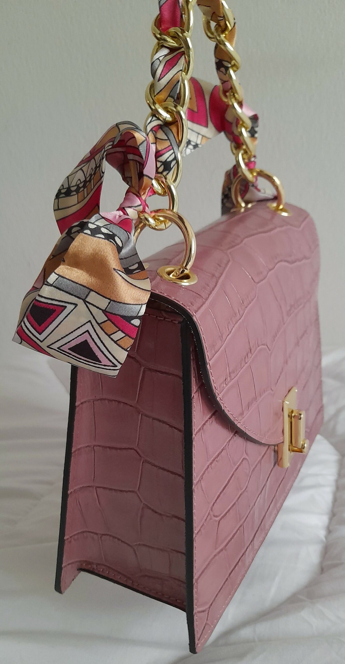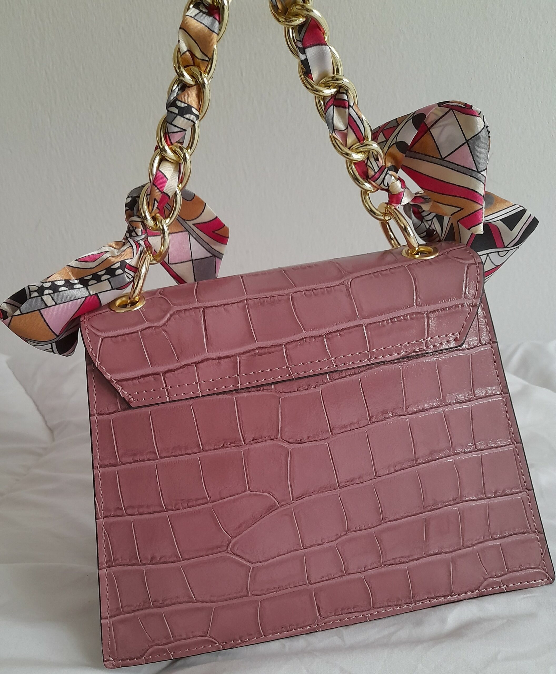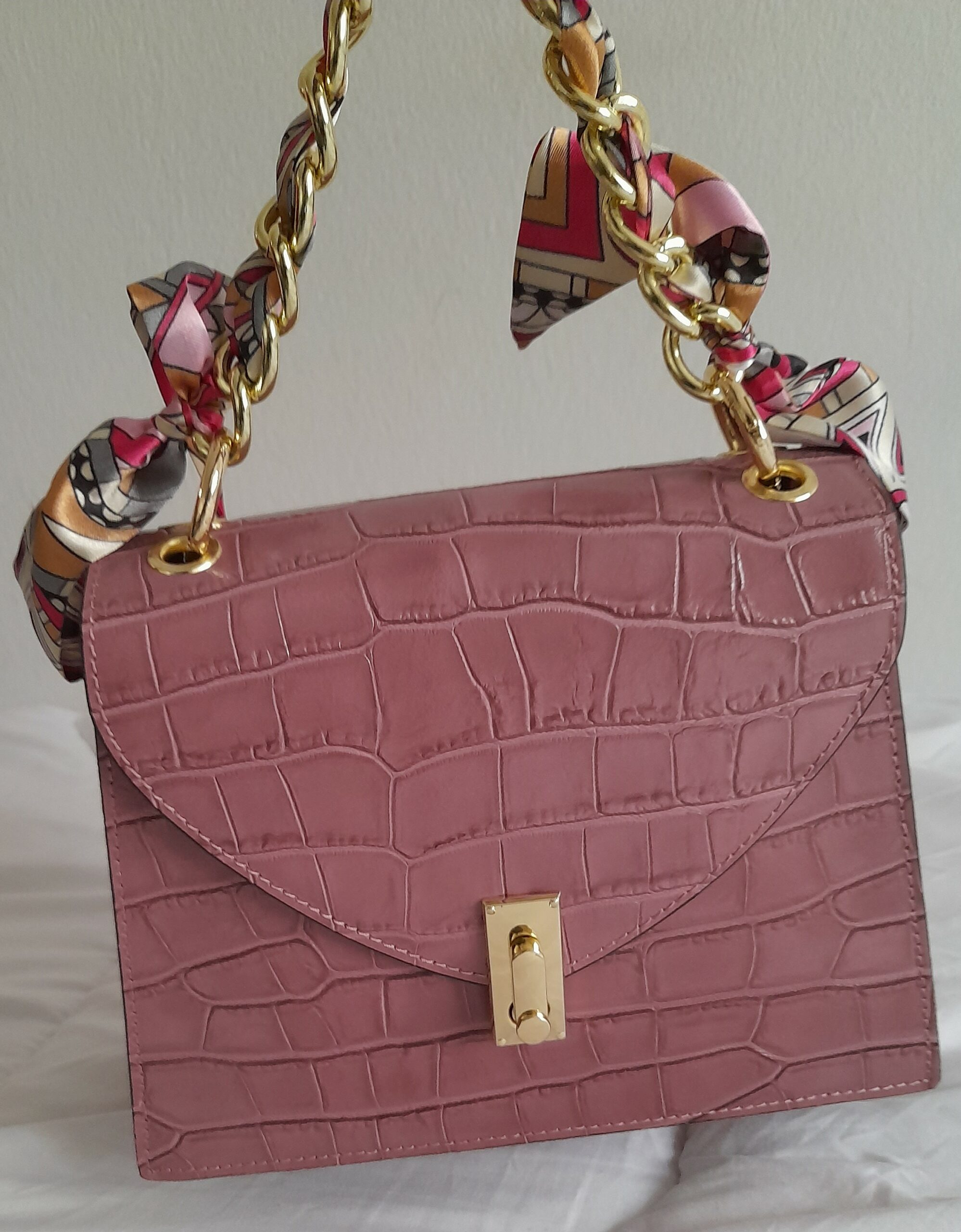 Sac à main en cuir Poignée Foulard imprimé Croco (Rose poudré)