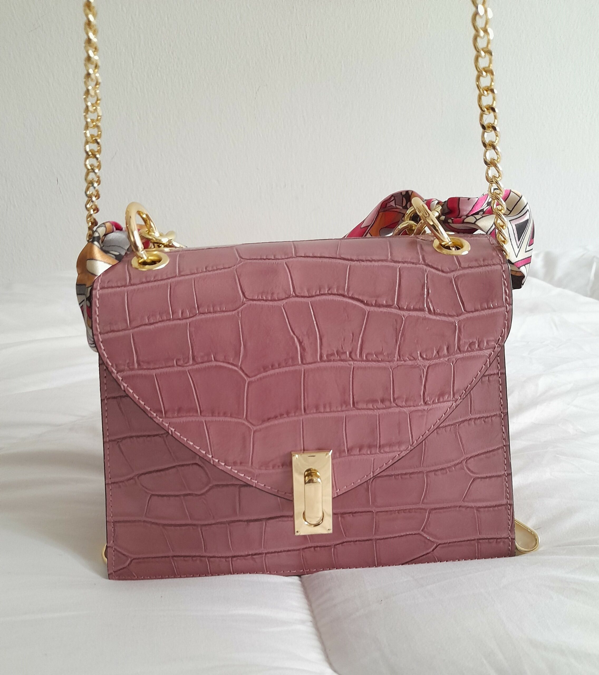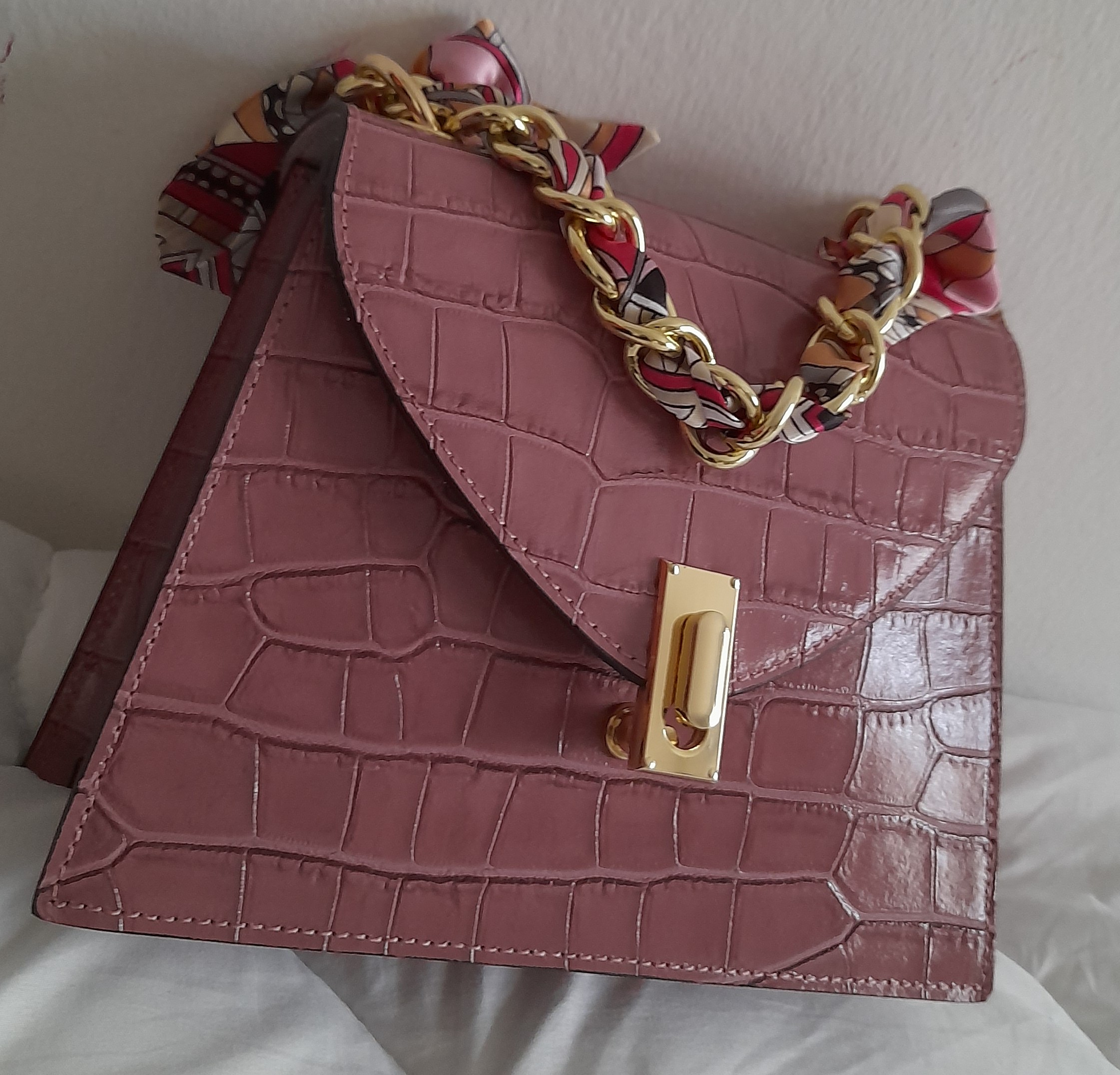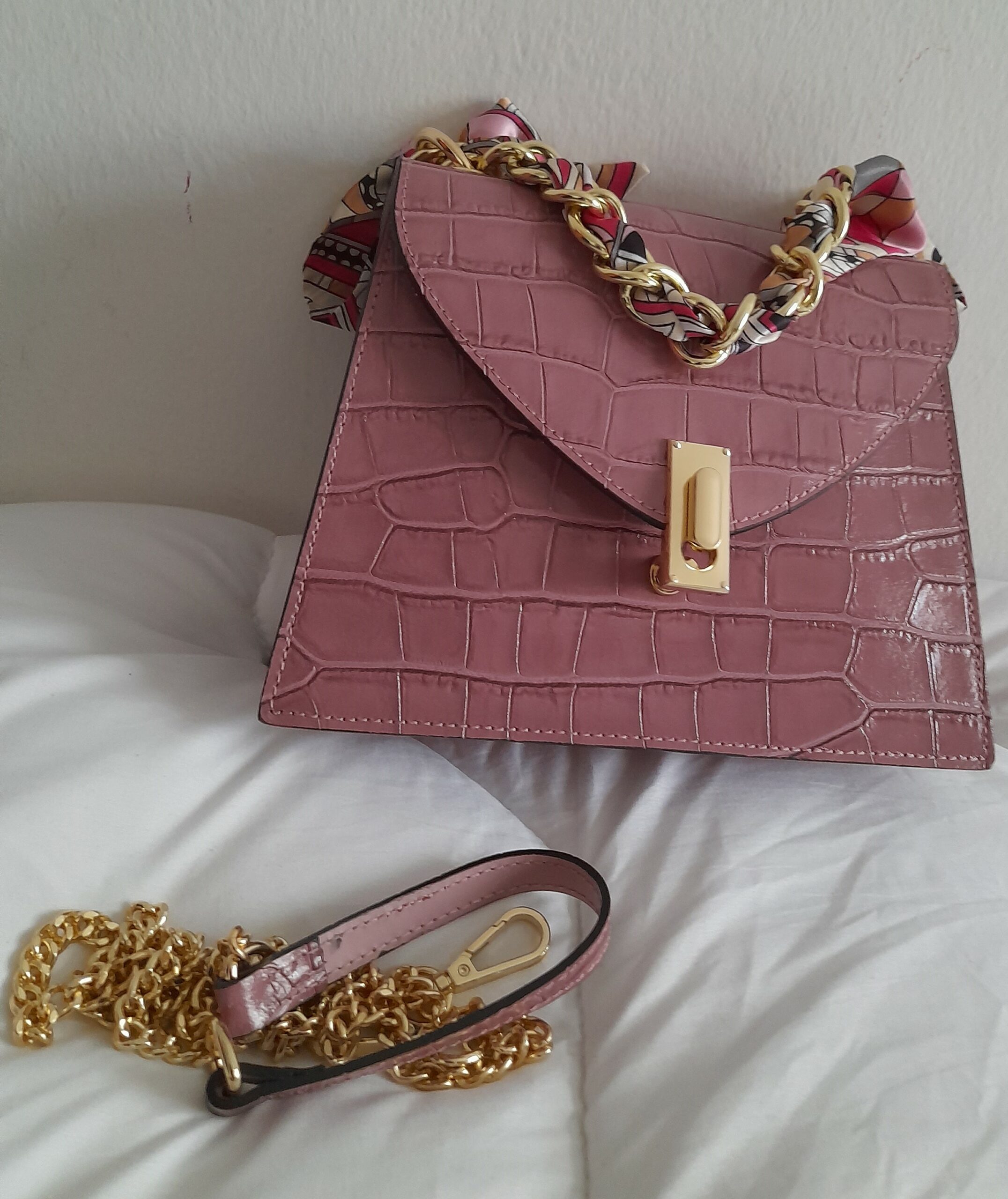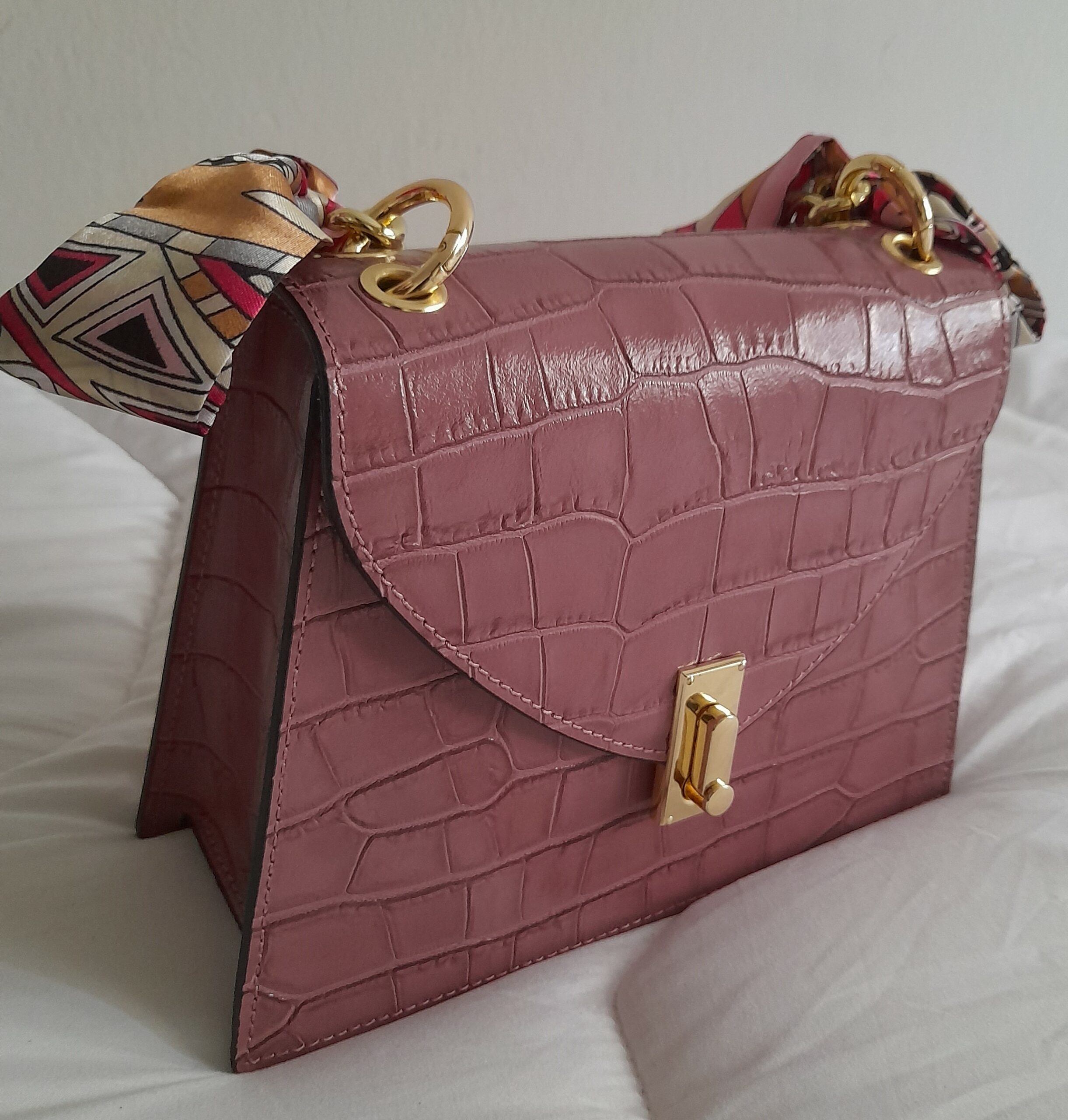 Sac à main en cuir Poignée Foulard imprimé Croco (Rose poudré)