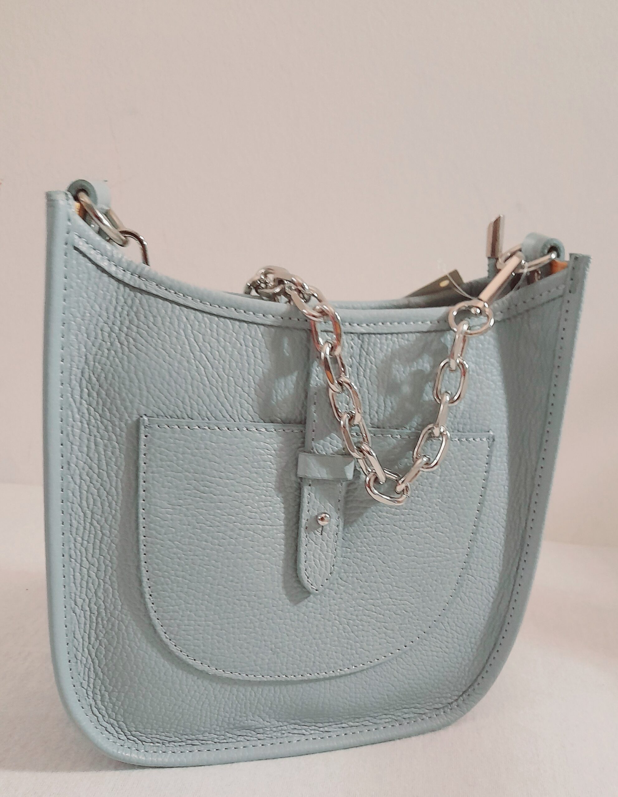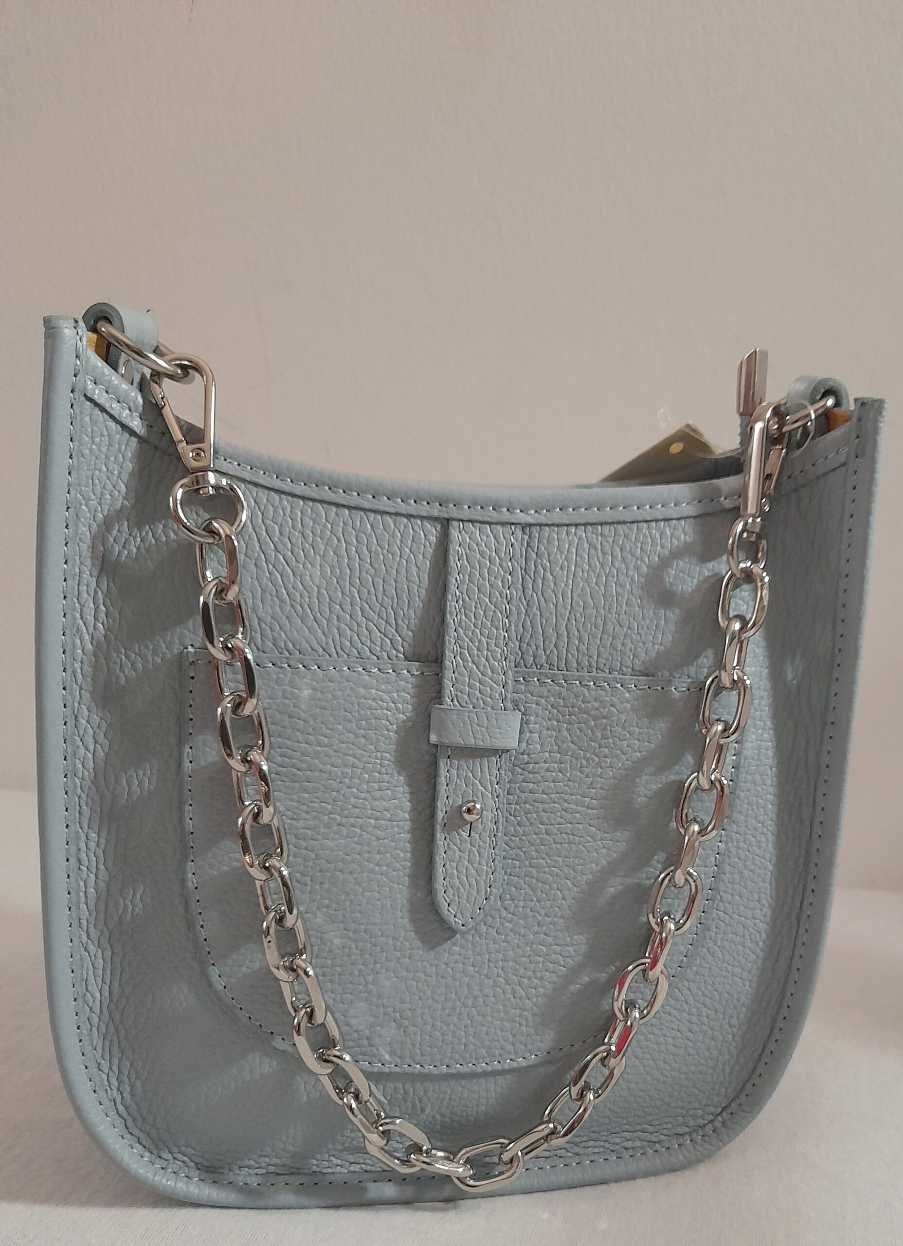 Grand cuir martelé, sans applications, uni, intérieur sans doublure, zip, poche interne avec fermeture éclair, poche externe avant, anse en chaine amovible + bandoulière en cuir.
