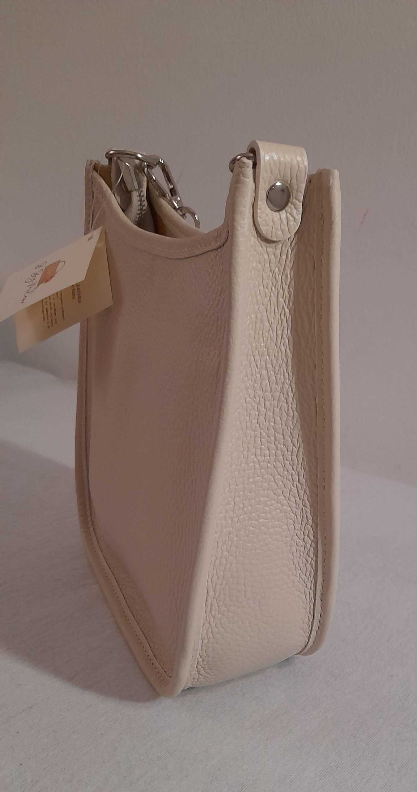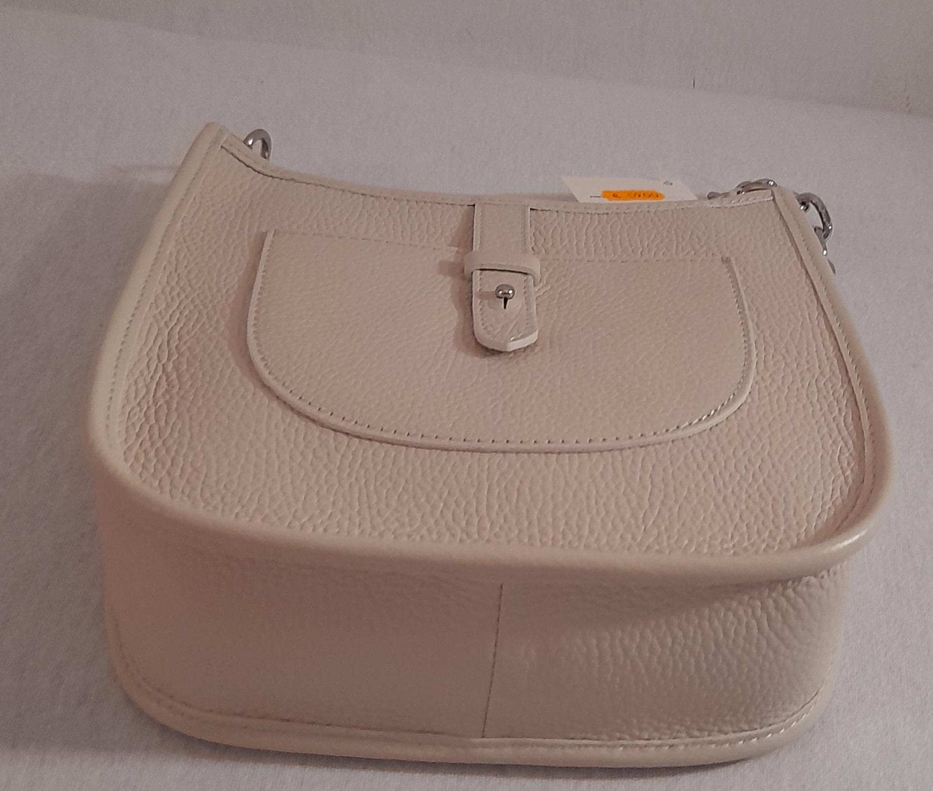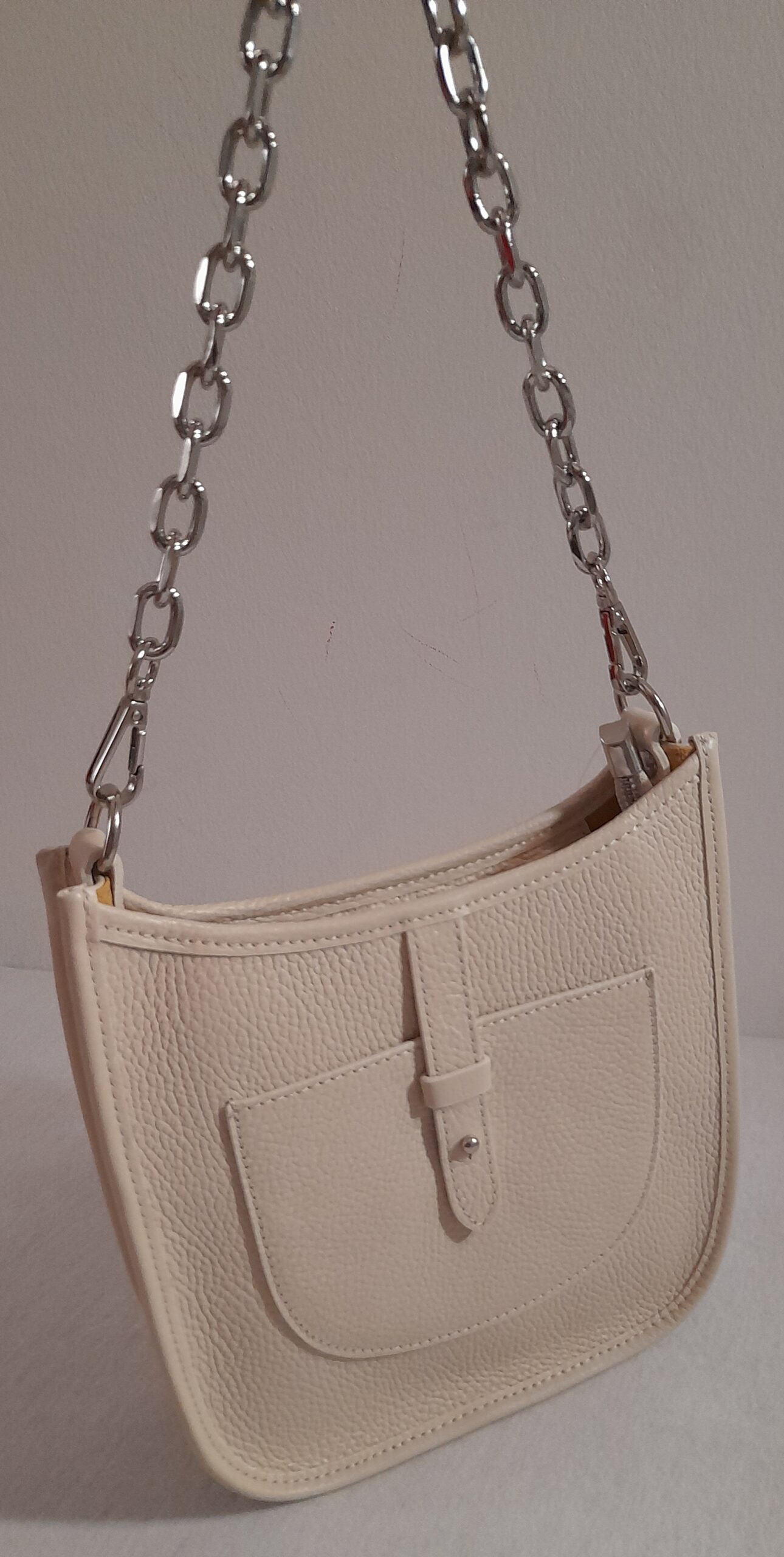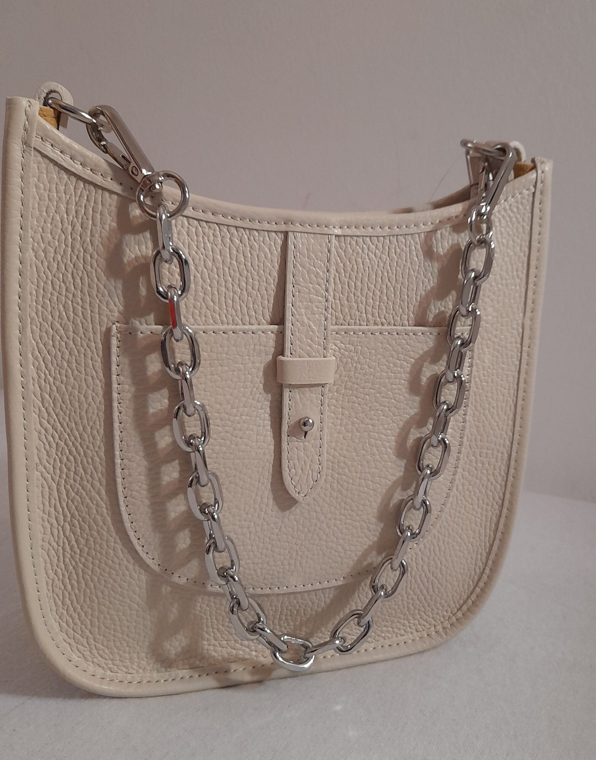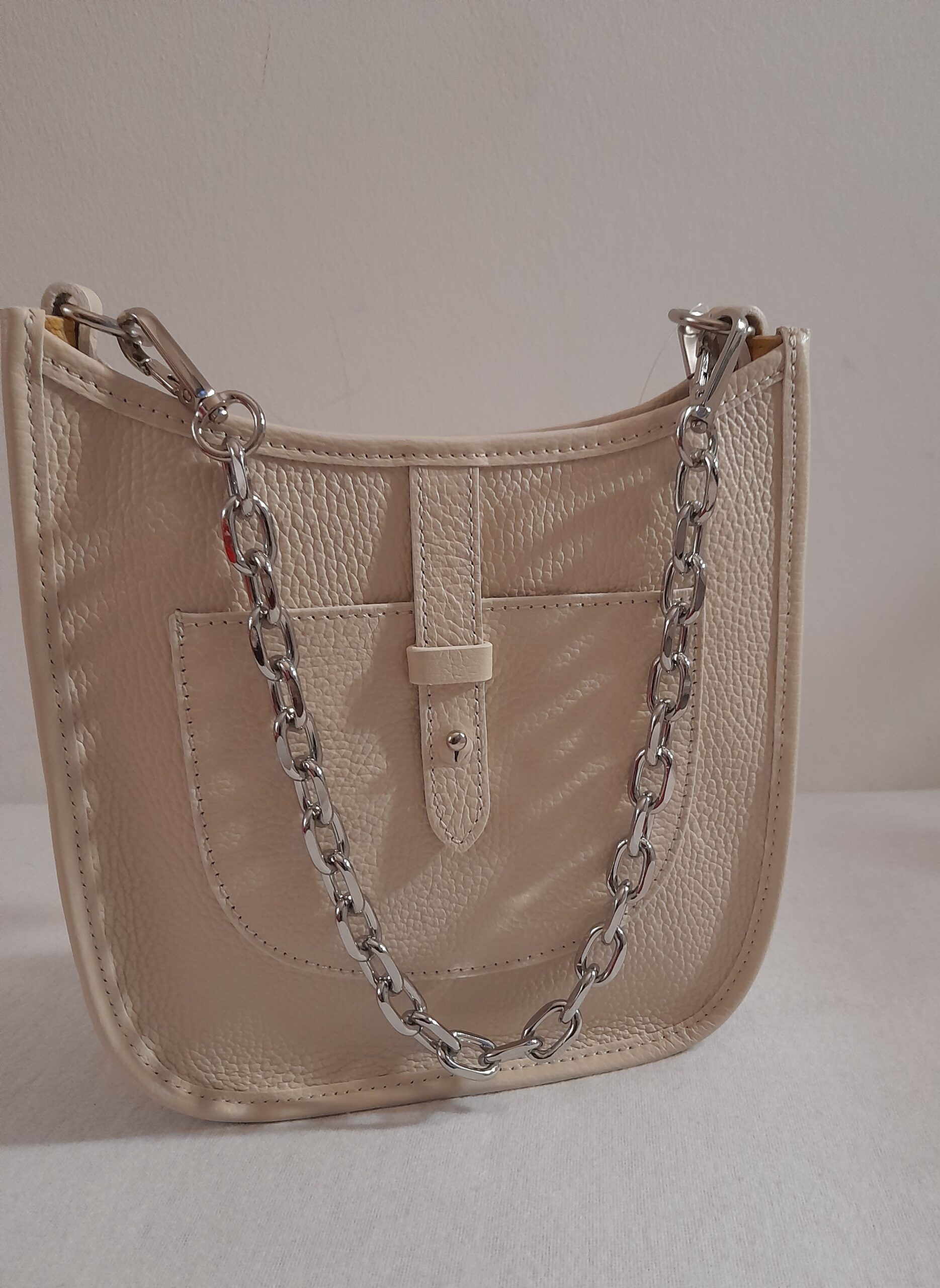 Grand cuir martelé, sans applications, uni, intérieur sans doublure, zip, poche interne avec fermeture éclair, poche externe avant, anse en chaine amovible + bandoulière en cuir.