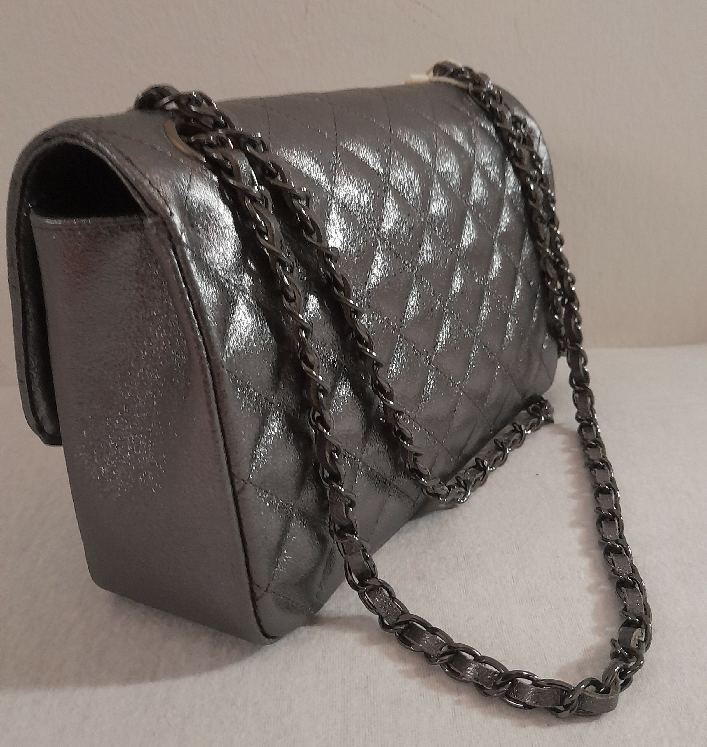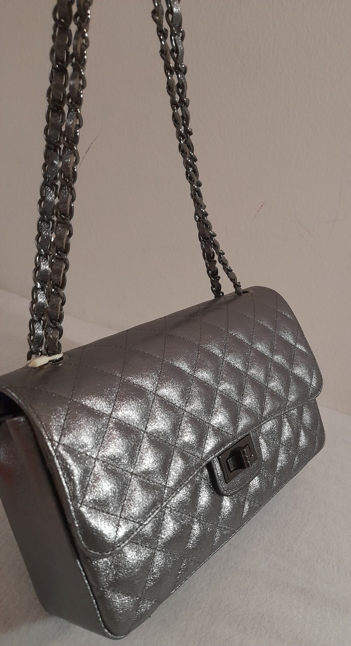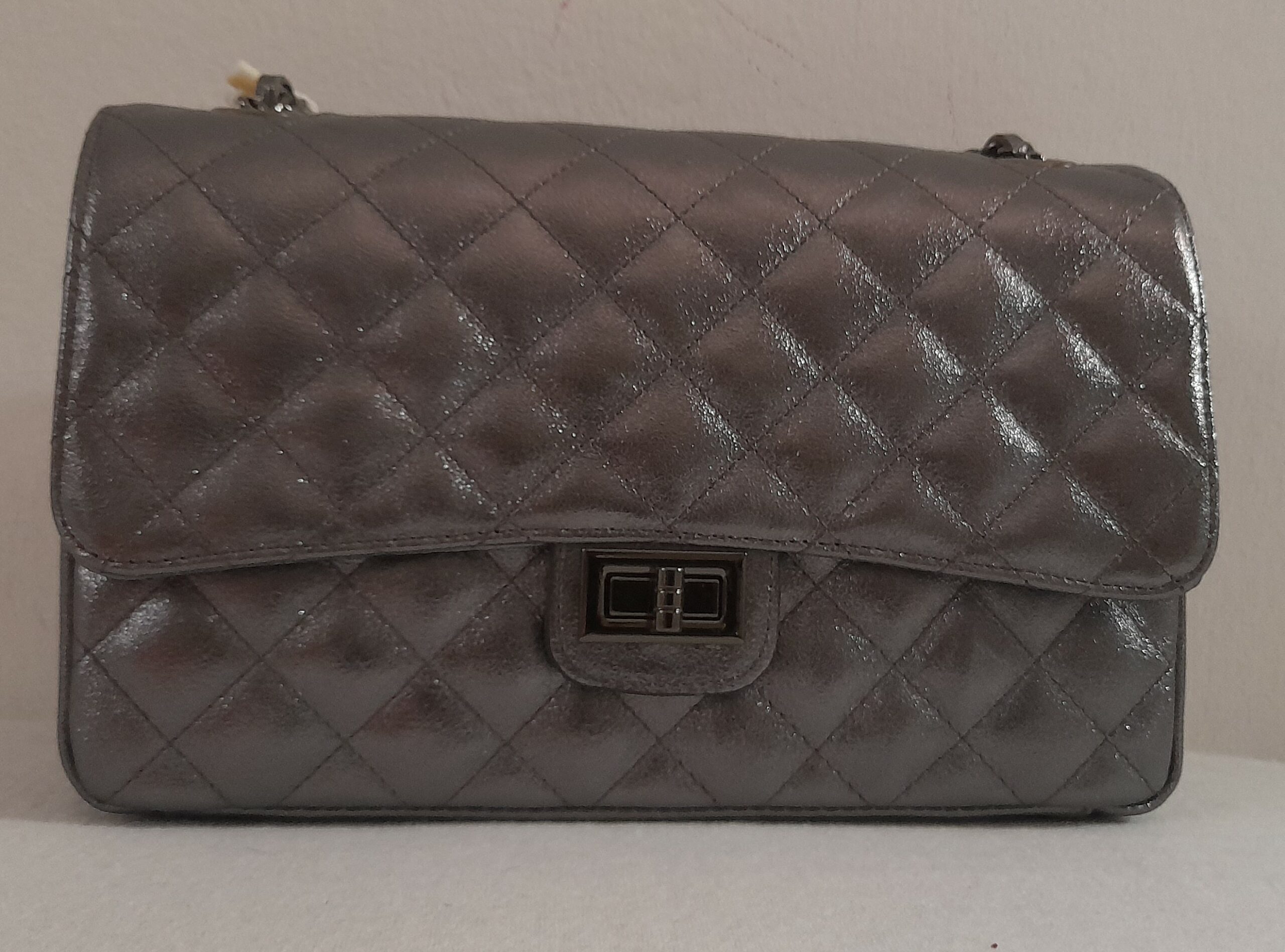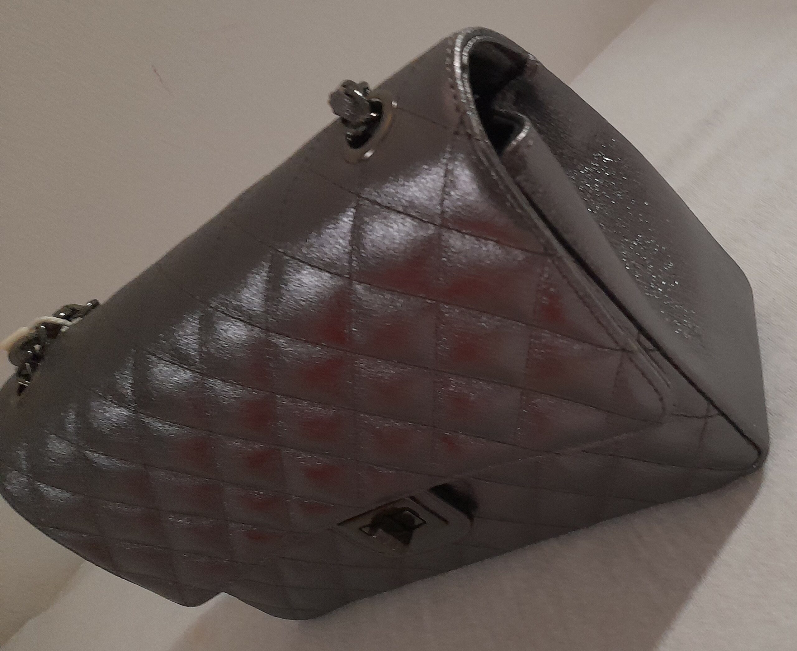 Sac à main matelassé en cuir avec chaîne laminé gris métallisé